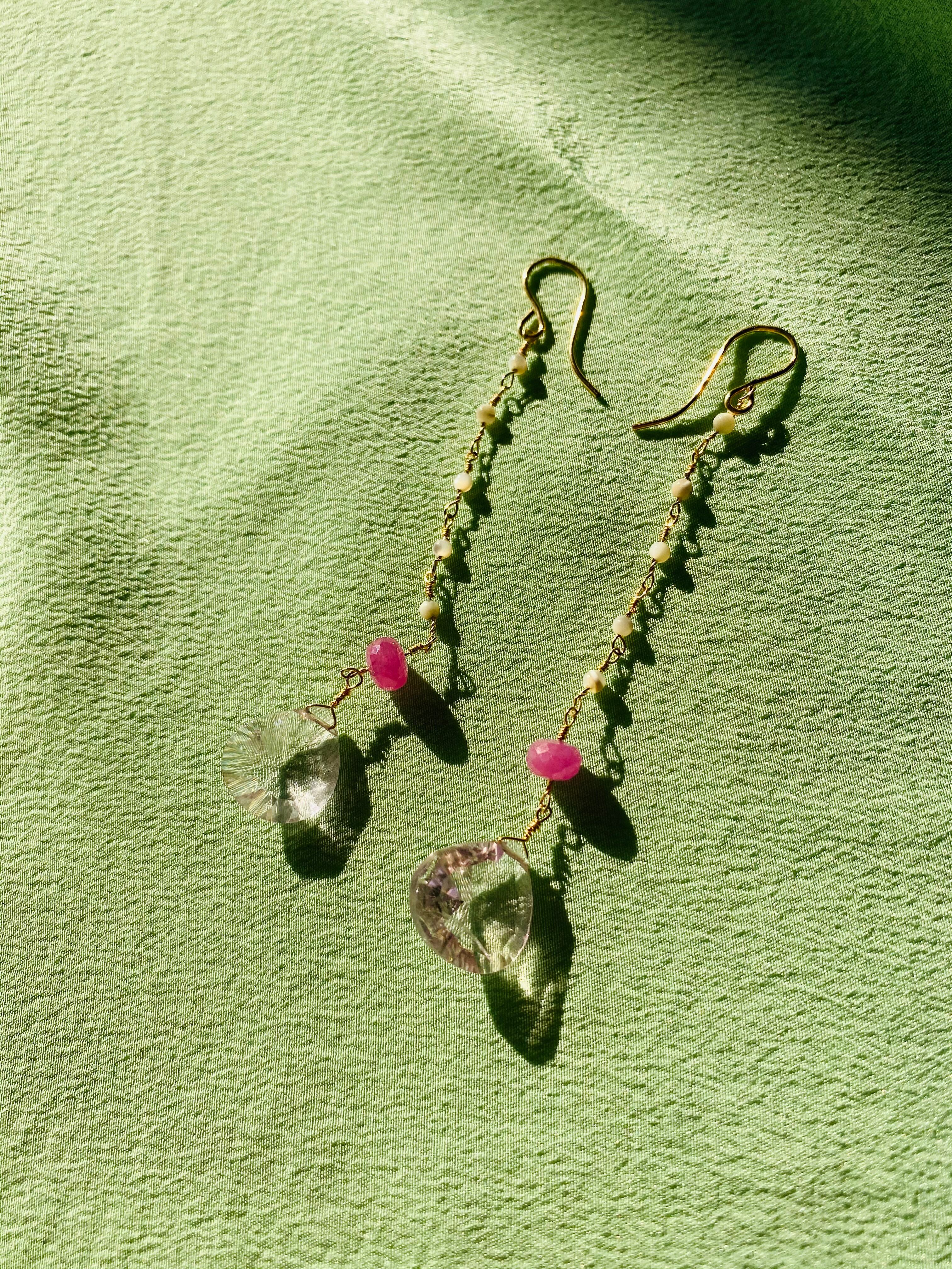 ピンクアメジストとサファイア、マザーパールを使用した華やかなロングピアスです。柔らかなパープルピンクのアメジストと、深いピンクのサファイア、上品な光沢を持つマザーパールが一体となり、視線を集める魅力的なアイテムです✴︎ ✴︎ ✴︎